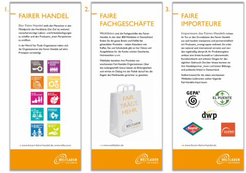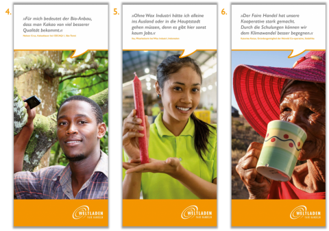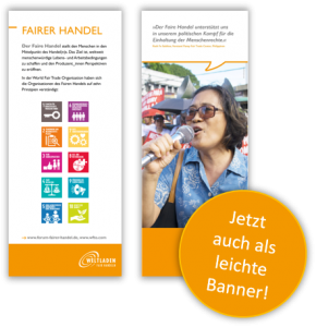 In der 10-teiligen Banner-Ausstellung wird der Faire Handel mit den für Weltläden besonders relevanten Aspekten kurz und knapp vorgestellt. Großformatige Fotos geben den Beteiligten ein Gesicht. Die Ausstellung wurde maßgeblich entwickelt von den Fair-Handels-Berater/innen in Rostock und Hamburg, mit unserer Unterstützung.