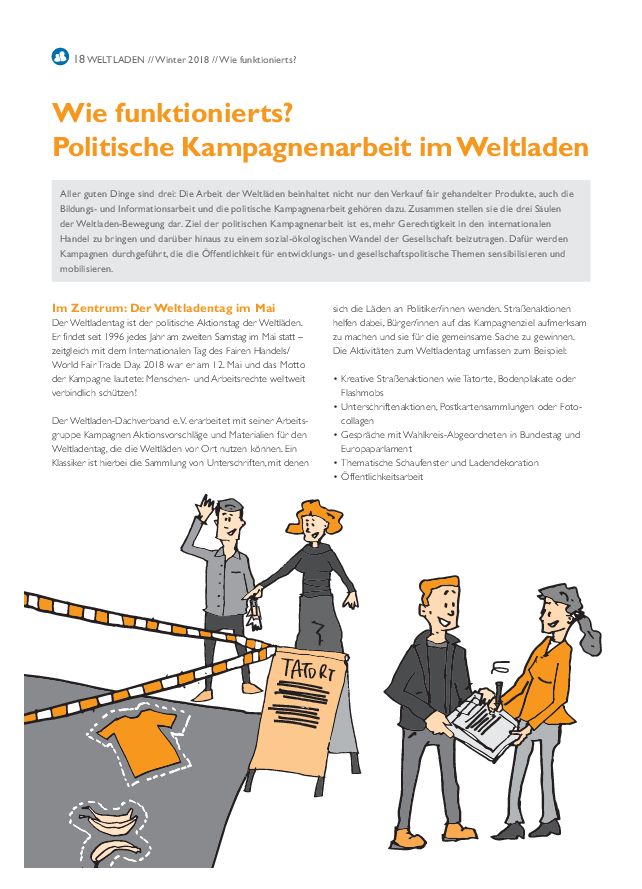 Öffentliche Tatorte, fiktive Haftbefehle und Unterschriften-Aktionen: Mit politischen Kampagnen-Aktionen informieren wir Bürger*innen über aktuelle Debatten und erhalten so Unterstützung für unsere Anliegen. Dafür nutzen wir vor allem den gemeinsamen Aktionstag, den Weltladentag, der immer am 2. Samstag im Mai stattfindet.