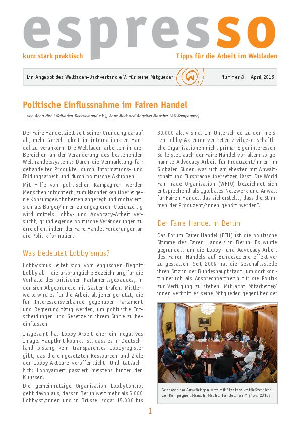 Weltläden sind in ihrer Kommune bzw. ihrem Wahlkreis mit Politiker*innen in Kontakt und bringen die politischen Forderungen der Fair-Handels-Bewegung ein. So führt ihr zum Beispiel Gespräche mit Lokalpolitiker*innen über die öko-soziale Beschaffung vor Ort, ladet Bundestagsabgeordnete in den Weltladen ein oder kontaktiert die Abgeordneten des Europaparlaments in eurem Wahlkreis.